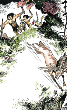 当北京人生活在周口店附近的时候,那一带的气候比现在温和湿润。当时的地形,北边是高高的群山,连接着北京的西山,西边和西南是蜿蜒起伏的山丘。山上山下长满了各种树木和丰茂的野草。凶猛的剑齿虎和狼、熊等野兽,聚生于森林中,出没于山野间,威胁着北京人的安全。当时剑齿虎的形态和大小同现代的虎近似,上犬齿扁平,有的前后有锯齿,利如短剑。剑齿虎捕捉食物时,口张得很大,非常凶猛。北京人因为常常同猛兽搏斗,而丧失生命。他们成群地出去打猎,主要是猎取肿骨鹿、梅花鹿、野羊和野马等。