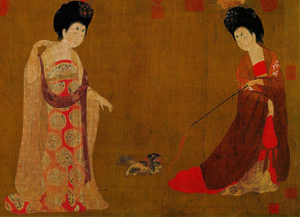 唐代妇女以体态丰腴为美,在画中表现的十分具体。同时期的壁画、陶俑妇女形象也大多如此,连石窟寺里的菩萨也是这种形状,反映了当时的审美情趣和社会风尚。盛唐以后,胡服的影响逐渐减弱,女服的样式日趋宽大。到了中唐时期,这种特点更加明显,一般妇女服装,袖宽往往四尺以上。其他无太大变化。