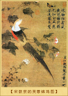 宋徽宗赵佶特别喜欢画花鸟,为此,他收集了全国各地的花卉珍禽。他的花鸟画以精工逼真著称,大都描绘栖于花枝的禽鸟,意境优美,形神兼备,他笔下的珍禽异鸟数量不少,但在绘画表现上却毫不雷同、各具新意。民间传说他有画龙点睛的本领。他用生漆点鸟睛,鸟眼看上去生动传神,栩栩如生。