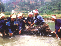 布依人在端午这天要在木楼上悬挂蒿莆和艾叶。这些都是长在河边的植物。据说,这样做也是为了纪念屈原:既未能在河里捞到屈原的遗体,便扯了河边的菖蒲和艾叶回家。这寓寄了布依人睹物思人的质朴深情。然而,这个习俗慢慢也发生了变化。菖蒲和艾叶在木楼悬挂的位置,渐渐被固定在大门的两侧,仿佛守门神秦琼和尉迟恭。怀念屈原的初衷,演绎为驱邪、消毒和治病。布依人不仅悬挂菖蒲和艾叶,还撒雄黄粉,饮雄黄酒。布依人认为,一年之中以端午节这天的药性最强,这一天治病效果也最好。因此,端午节草药摊特别多,到医院看病的人也多。各家各户还熬草药,浴“百草汤”,用药煮过的丝线为孩子缠手,并以丝线系药袋,挂在孩子胸前,名为系“长命缕”。