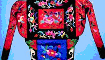 4、贵阳市郊、黔南州西部、黔西南州和安顺地区一些县,妇女上身多穿大襟衣,下着长裤,多数地区衣裤边缘镶栏干,但各地有所不同。普安、晴隆一带衣长过膝,包青布头帕,一端垂盖后颈。贵阳市郊及附近几县上衣长至膝盖,多无小领,姑娘以发辫挽头数圈,有的包头帕,有的不包,普遍挂围腰,绣有各种精致图案。婚后包头帕为蓝布头巾。