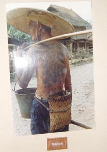 在汉唐以来的古籍中常有对包括西双版纳各民族在内的“百夷”的“文身”描述,其历史久远。在西双版纳各民族中,主要是傣族、布朗族的男子有文身的习俗。他们在腿、胸、背、臂等处,用针刺各种纹饰,涂以蓝靛或胆汁等成青色而终生不褪,这是一件很痛苦的事。据近代《车里》一书的归纳,文身的图案大体可分为四类:一是动物类,有象、虎、豹、龙马、鹿、猴等;第二类的图案有云纹、方形、圆形、花卉等;三是文字类,有傣文佛咒和成句佛经;四是其他类,有曲线、直线、几何图形等。