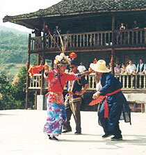 彩莲船、舞龙灯、玩狮子的队伍到达预定地点,在彩亭前摆设香案,向“牛王神”三鞠躬后,就开始扮耕。人们给“牛王”套上犁,由成年男人搀扶小孩作犁田架式。之后,“春官”高念:“一打牛头,寨泰民淳;二打牛腰,风调雨顺;三打牛尾,五谷丰登。”然后把“春牛”打坏,人们争先恐后撕扯“春牛”残部,抢到一片者象征着该家当年丰收,家庭吉祥如意。《石柱县志》载:“过牛王节……到牛王庙烧香,唱牛王戏。”这便是佐证。如今,“打春节”在县城不再时兴过,但在黄水镇、石家乡、枫木乡等地,却仍然热闹,成了土家山寨一道亮丽的风景线,让过往游人大饱眼福。 |