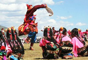 藏族人民热情开朗、豪爽奔放。他们以歌舞为伴,自由地生活。藏族民歌抑扬顿挫,合辙贴韵,悦耳动听。唱时还伴以各种舞蹈。舞姿优美,节奏明快。其中踢踏舞、锅庄舞、弦子舞最为广泛流传。 |