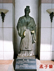 孟子(前372-前289)名轲,战国中期鲁国邹人。受业于子思(孔子之孙,名)之门人,曾游历于宋、滕、魏、齐等国,阐述他的政治主张,还曾在齐为卿。晚年退而著书,传世有《孟子》七篇。他是战国中期儒家的代表。